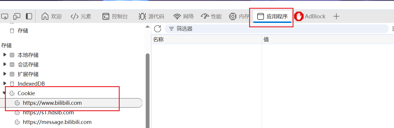 F12打开控制台 - 点击应用程序 ,选择Cookie , 点击第一个哔哩哔哩网址